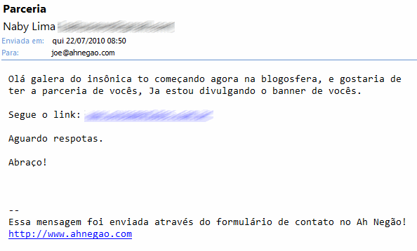 Diariamente recebo toneladas de bizarrices por email. A maioria é de aspirantes a blogueiros que não leem as políticas de parceria, e saem pedindo parceria até pro Papa. Acho que até agora nenhum pedido de parceria me fez rir como esse, que veio hoje: