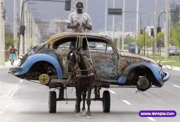 Tenho que admitir, levar uma carcaça de Fusca numa carroça minúscula, e com um cavalo meio manco, é um feito digno de respeito.