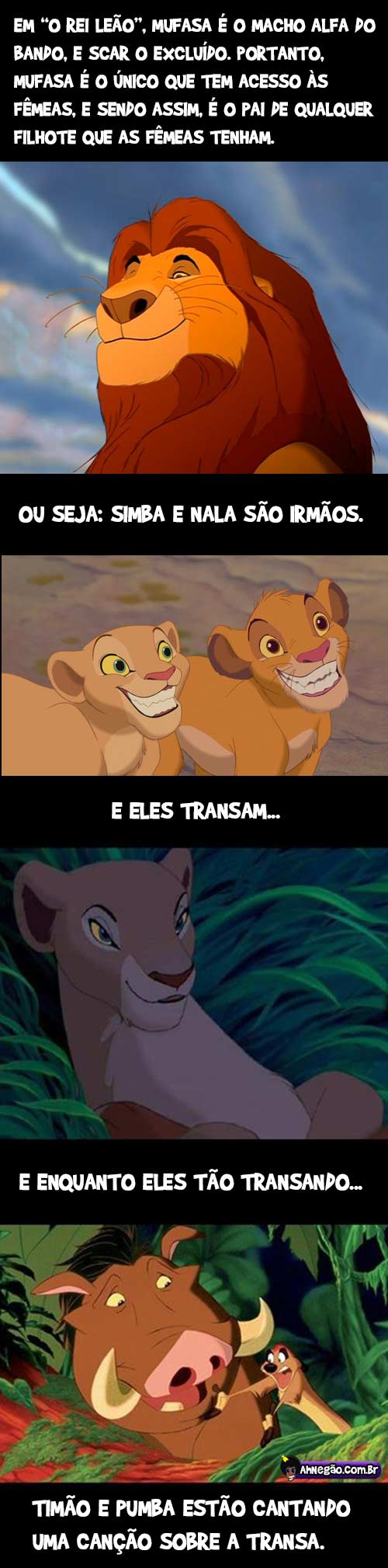 Verdades sobre “O Rei Leão” 21/03/2013 21/03/2013 Bom, funkeiros cantam sobre fornicações o tempo todo né… Tweet TAGS: O Rei Leão Comentários