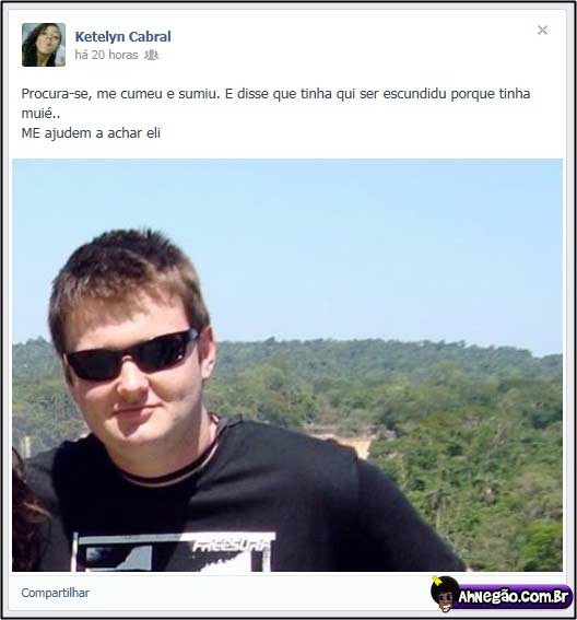 Procura-se rapaz desaparecido 15/07/2013 15/07/2013 Estou apenas fazendo minha parte, ajudando a moça a encontrar o rapaz. REPASSEM. Via Bobagento. Tweet TAGS: Comeu e sumiu Comentários