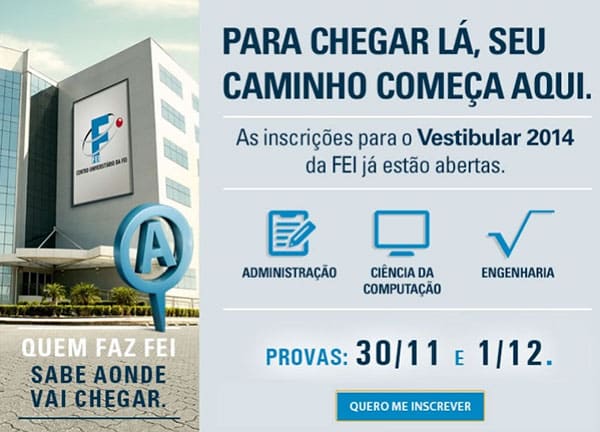 As inscrições para o vestibular FEI 2014 vão de 23 de setembro a 22 de novembro de 2013, e as provas acontecem nos dias 30/11 e 1/12. Você pode se inscrever clicando aqui ou na imagem.