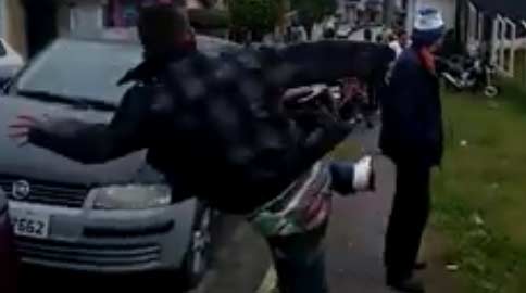 Eu tive dificuldade para interpretar o que rolou aqui. Pra mim, esse álcool em forma de gente achou que bola tava vindo e quis meter um VOLEIO BEBETOSO DE REVESGUEIO pra impressionar a galera. Ou ele quis acertar o cara…