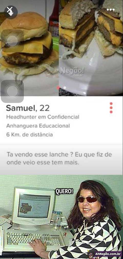 Da série: estratégias de sucesso no Tinder 26/04/2016 26/04/2016 Bróder, por um hamburgão pegado todo dia qualquer um passeia de mãozinha com você no shopping. Tweet TAGS: Só faltou o beicão Comentários