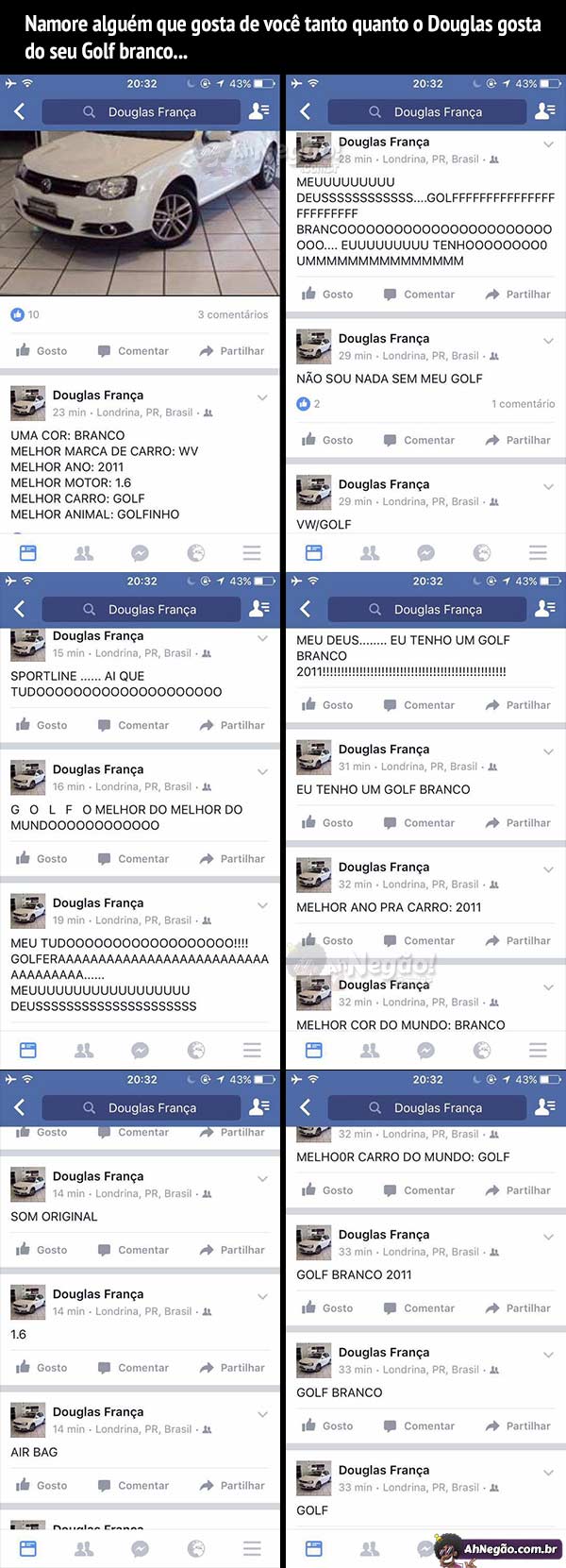 Daqui a pouco ele troca o nome pra GOLF BRANCO. A vida dele agora é um Golf branco. Ele deve estar lambendo o carro nesse instante.