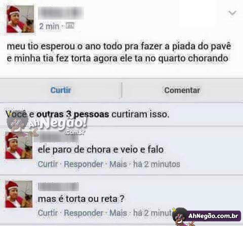 A piada do pavê foi arruinada 29/08/2016 29/08/2016 Tem certos tios que tem um nível mais alto de piadas. O termo técnico é ULTRATIO. Esse tipo de pessoa não morre nunca. Tweet TAGS: ULTRATIO Comentários