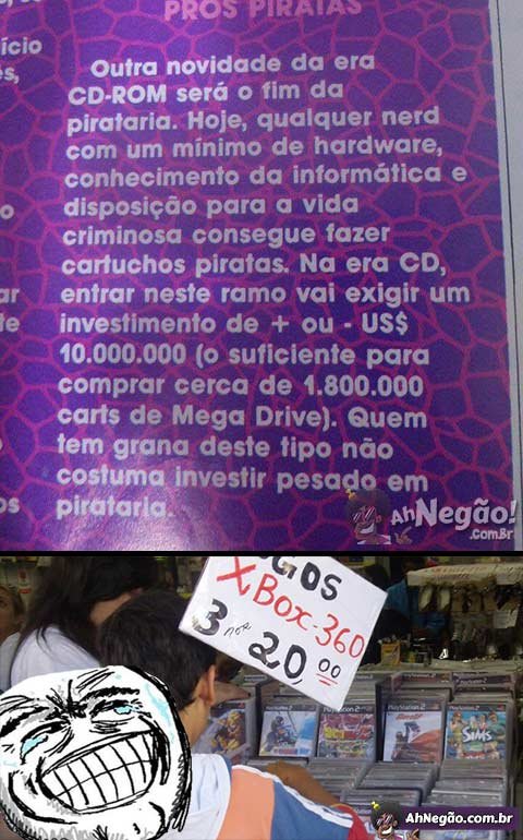 Chega a ser bonito esse sentimento de que tudo vai dar certo. O tal investimento de 10 milhões se transformou em 500 pila por um PC meia boca com gravador de CD. Pirataria é errado mas era tão bom, principalmente na época do famoso BOMBA PATCH.
