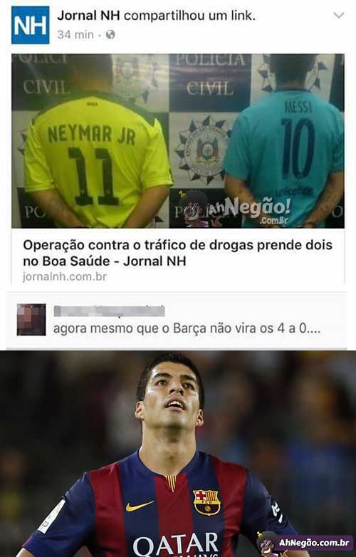 Te vira sozinho agora Suarez. Aliás de todos os trios de ataque do mundo, só no Barcelona o trio tem 2/3 de sonegadores de impostos. As chances dessa cena realmente acontecer foram altas há alguns anos.