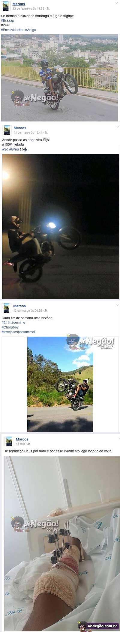 Menos de um mês depois de começar, a história de Marcos e sua moto teve um desfecho. Hoje é uma perna, amanhã são costelas, depois o corpo todo, mas o que importa é dar grau na frente das gata.