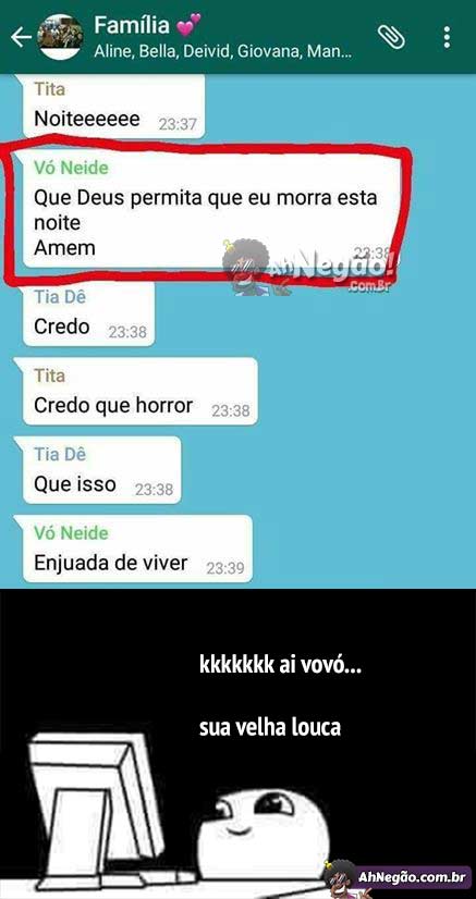 Vovó tá só no ronco do toddynho, com o bilhete na mão, esperando o trem pro além. Não tem mais saco pra grupo da família, nem de pessoas como um todo. Vovó já dorme de mala pronta, com a mão pra cima, esperando Deus vir buscar…