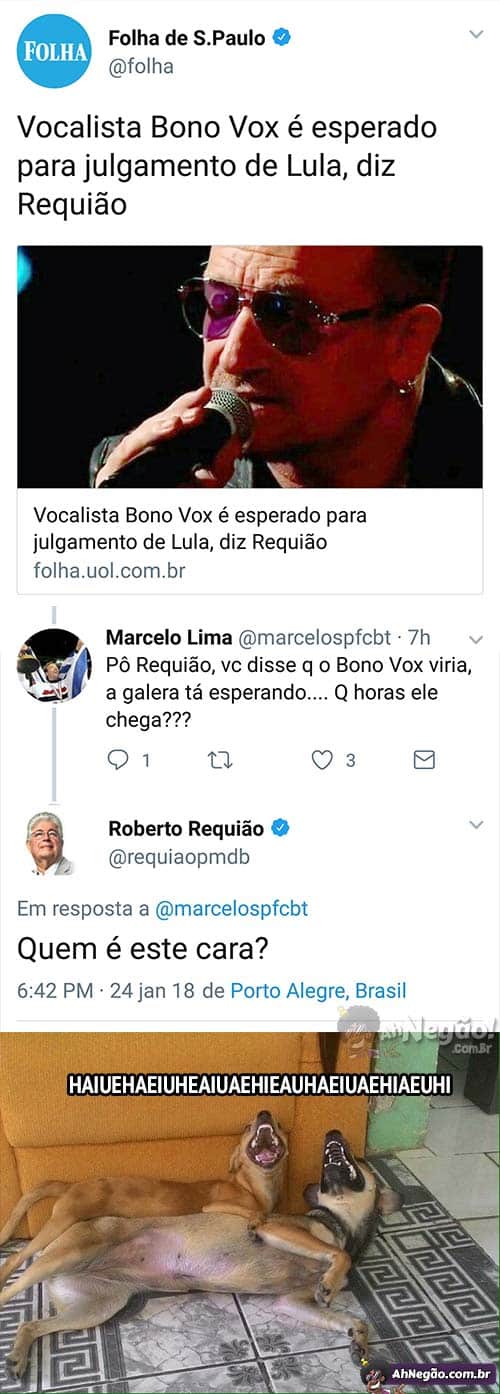 O boato de que Bono Vox viria ao Brasil para o julgamento de Lula 25/01/2018 25/01/2018 Ai, a internet as vezes é show… PÔ REQUIÃO CADÊ O BONO? TU NÃO IA TRAZER O CARA? A internet nunca esquece. QUEREMOS O BONO! Tweet TAGS: Requião vai trazer o Bono Comentários