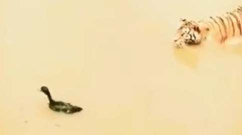 O mais legal é que depois ele segue nadando, ignorando totalmente a presença de um tigre no lago. Ele é muito hardcore.
