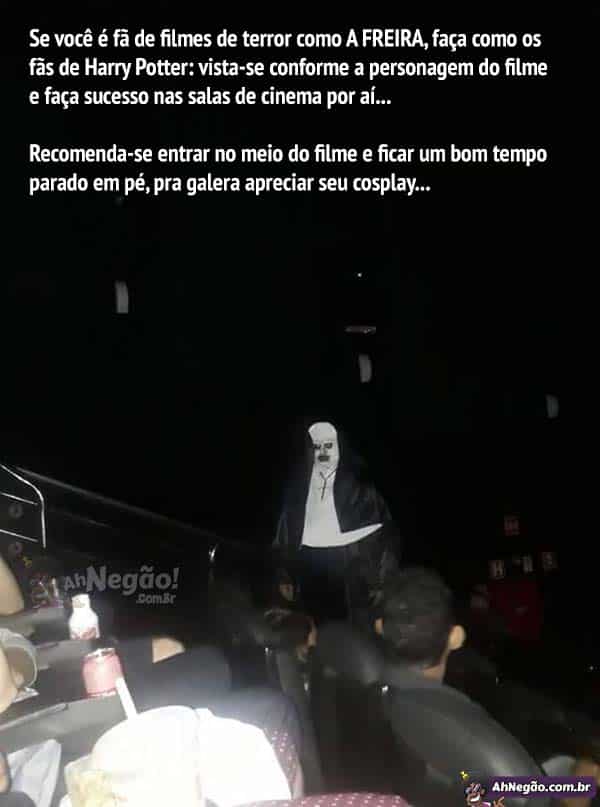 Entre bem quieto, de preferência com um pano preto na cabeça que é pra aumentar a surpresa. Pare ao lado das poltronas mais cheias bem no meio do filme. Tire o pano preto e fique ali mostrando sua fantasia em silêncio.