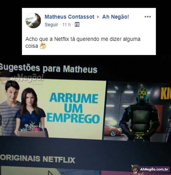 Agora a Netflix percebe quando você fica 8 horas vendo série em dia de semana ao invés de fazer algo útil. O algoritmo se chama DETECÇÃO DE VAGABUNDOS, e já abre um link direto com um site de empregos.