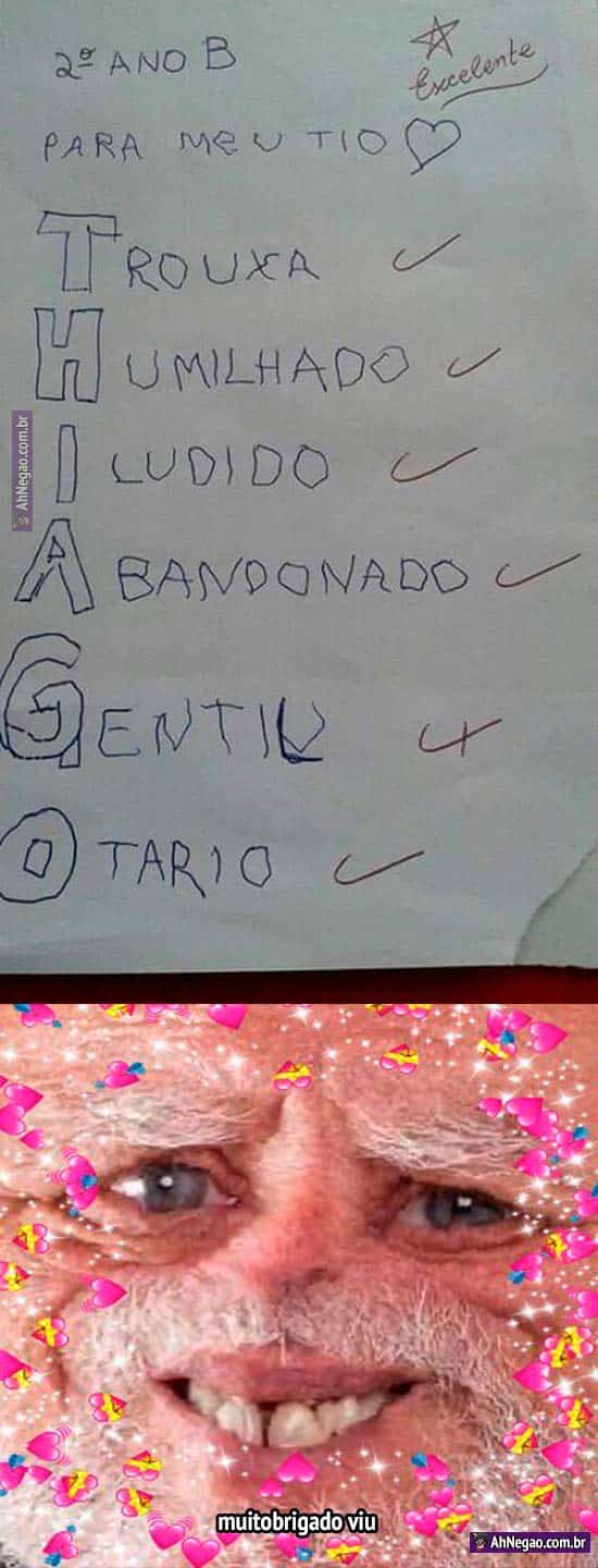 Mais um tio lindamente homenageado por um sobrinho querido 28/10/2019 28/10/2019 O mais legal é que no único elogio, ele ganhou um meio certo. Não tá fácil pro Thiagão… Tweet TAGS: Para o titio Comentários