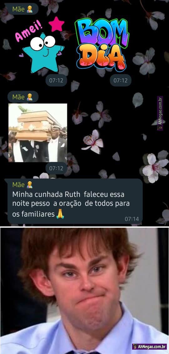 Incrível como ela vai de figurinhas de bom dia pra uma figurinha do meme do caixão pra mensagem de luto em apenas dois minutos.