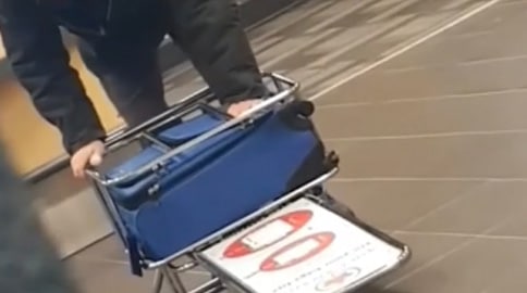 Pra quem não sabe, essa coisa de metal serve pra você colocar sua mala de mão e ver se ela encaixa no compartimento de bagagem do avião.