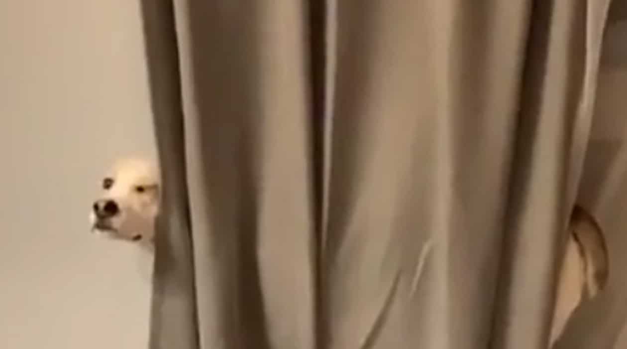 O cachorro que se escondeu atrás da cortina para tramar algo