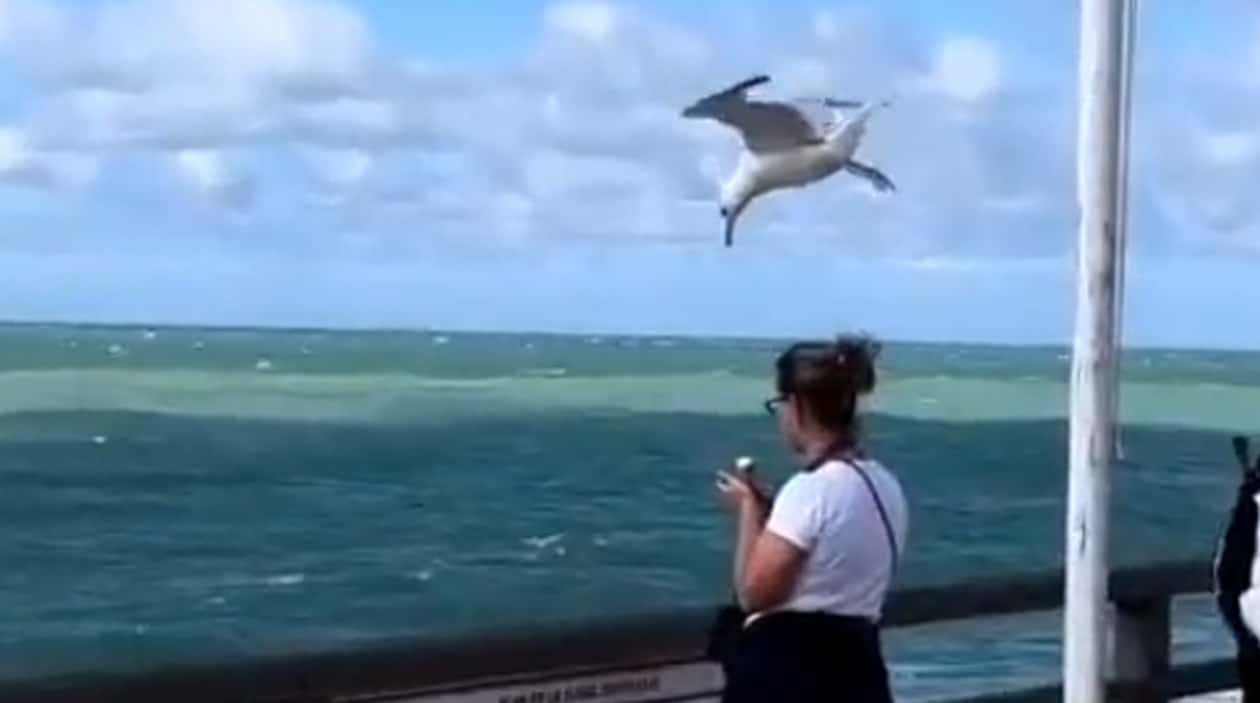 Essa gaivota já tá em outro nível de furtividade. Até aprendeu a parar no ar pra surpreender a vítima.