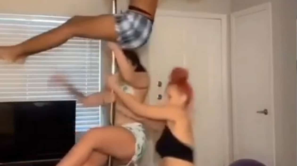 Tem que ter muita confiança no produto pra se pendurar nesses pole dance caseiros sem se preocupar, aí elas vão lá e sobem 3 ao mesmo tempo…