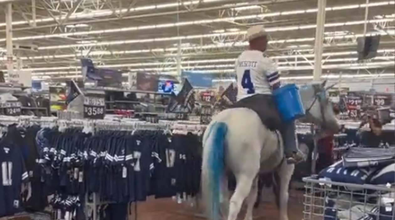Ao menos que o cara seja deficiente e usa o cavalo como meio de locomoção (o que seria incrível), nada justifica essa cena peculiar.
