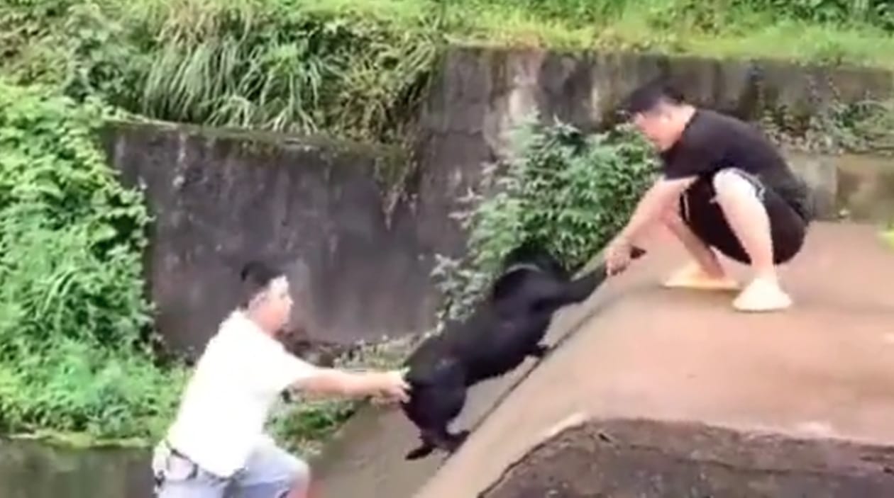 Ou ele se fingiu pra ser resgatado e assim não precisar fazer esforço pra subir de volta, o que seria genial da parte do cachorro…