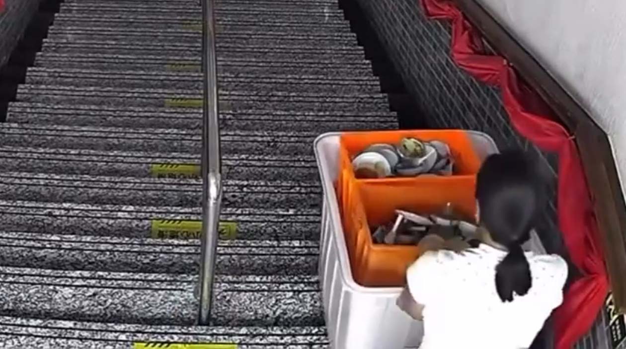 O destino da mulher que tentou descer uma longa escada com um carrinho cheio de louça suja