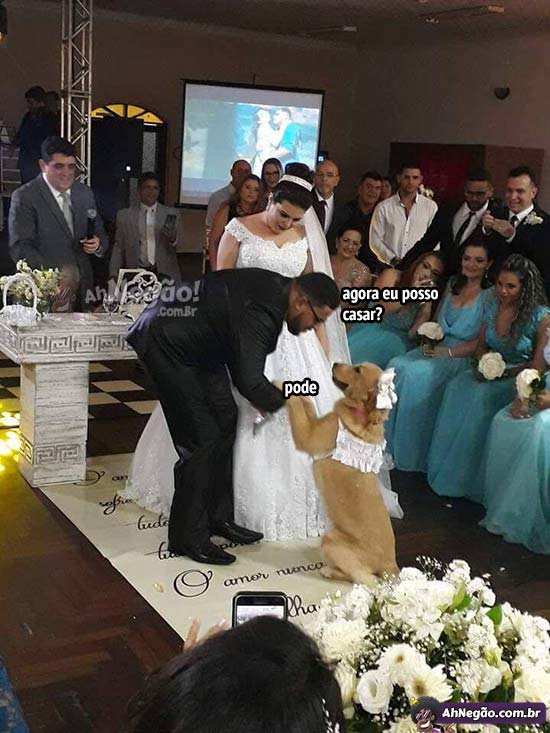 Tiveram que interromper a cerimônia pra que a cachorra falasse com o noivo. Se ela não aprovar, não tem casório.