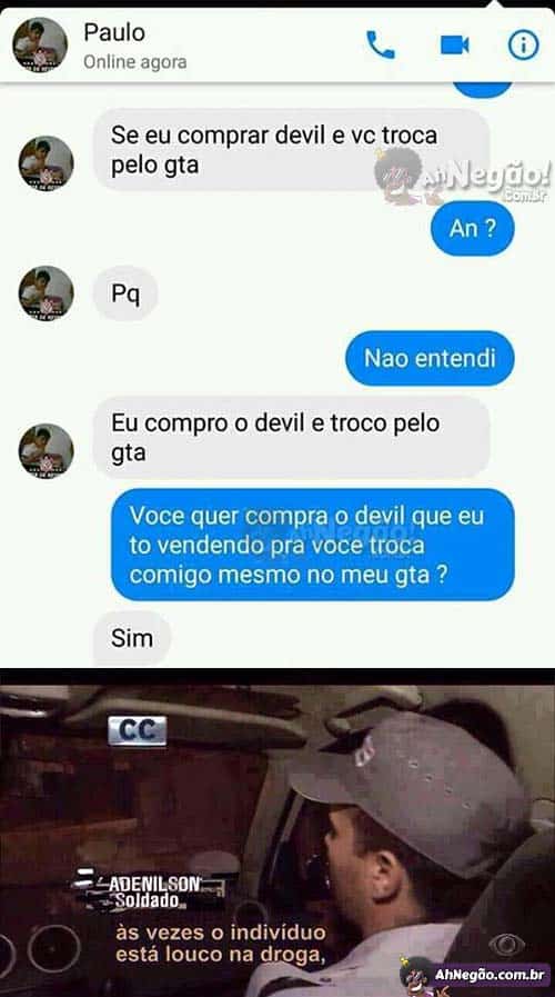 É a representação moderna daquela cena do Chaves vendendo churros pra ele mesmo. Acredito que o GTA esteja mais caro que o Devil, senão não faria sentido. Na verdade mesmo assim não faz sentido. Menino Paulo está nos tóchicos.