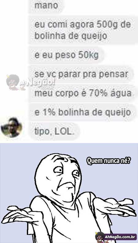 Me pergunto como a pessoa pesa 50kg e ainda está viva. 50kg é só o peso da minha perna esquerda. No meu caso eu precisaria de um balde de bolinha de queijo pra que ficasse 1% do meu peso.